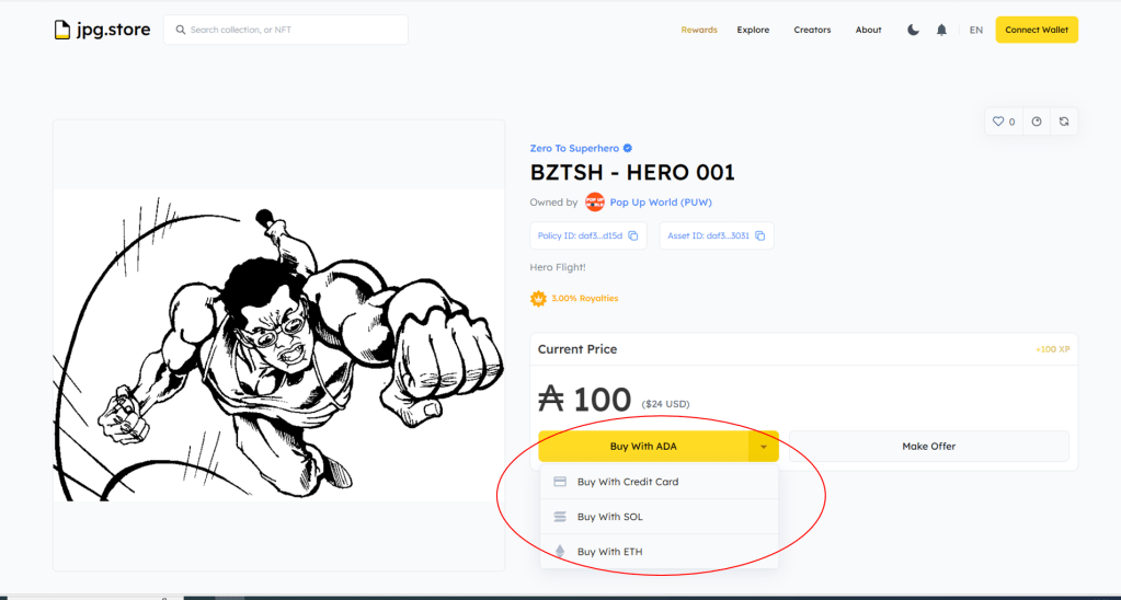 Browse the collection page and find an NFT that you like the look of. Click on the yellow button dropdown to show your purchase options. You can buy the NFT with ADA, a normal credit card, Solana or Ethereum. Here we will pay with a card as an example.