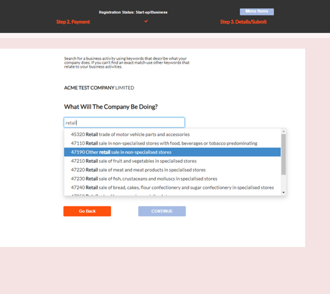 If the company you searched for is available you will get the following page, if your company name is not available you will be redirected to try again.