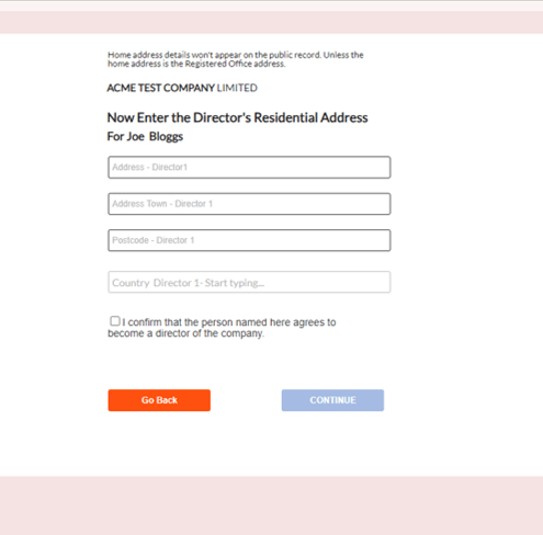 Next, enter your Residential Address. This is where you live. Your residential address will not be made available in the public record unless it is the same as your Company’s Registered Address you entered earlier. Tick the box to confirm that the person named agrees to become a director of the company you are forming.