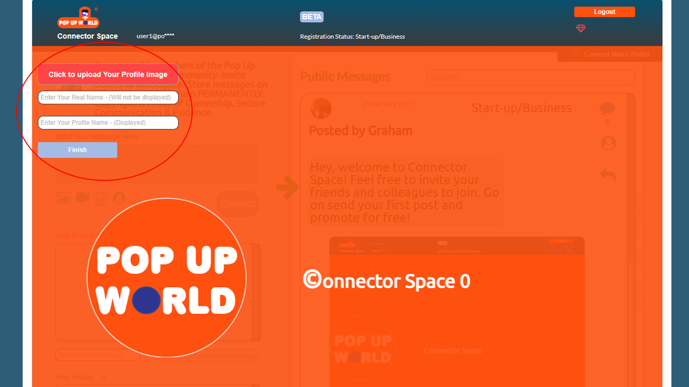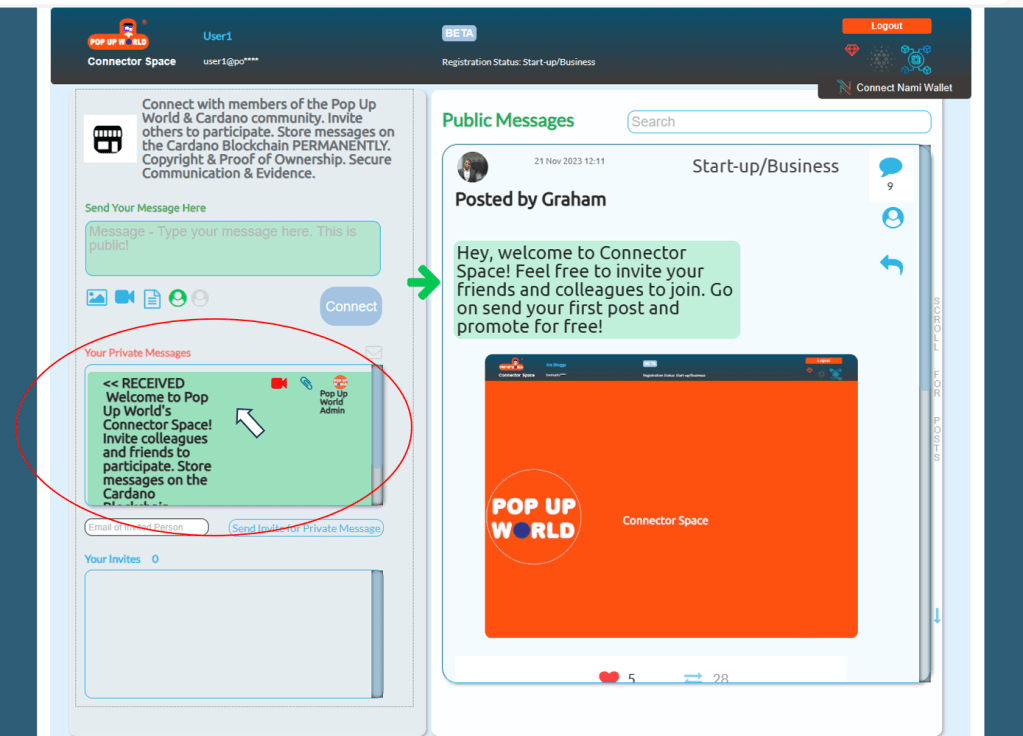 Connector Space allows you to promote your stuff via both Private Messages and Public Messages most importantly Private Messages are encrypted meaning that only you and the receiver can read your private messages. Connector Space is free for all Pop Up World members. Connector Space also allows you to store documents, conversations and information on the Cardano Blockchain permanently timestamped and can act as Proof of Copyright and Proof of Ownership.