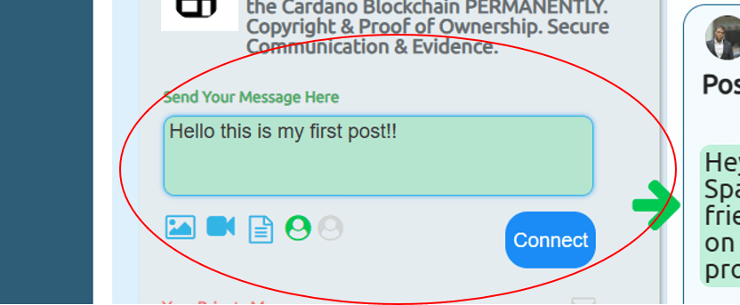 Ensure the arrow is Green and pointing towards Public Messages. Enter your message in the Message Box. You can add an Image, Video link or a File. Click the Blue Connect button to post your message. Make sure your message is correct as it cannot be deleted once posted.
