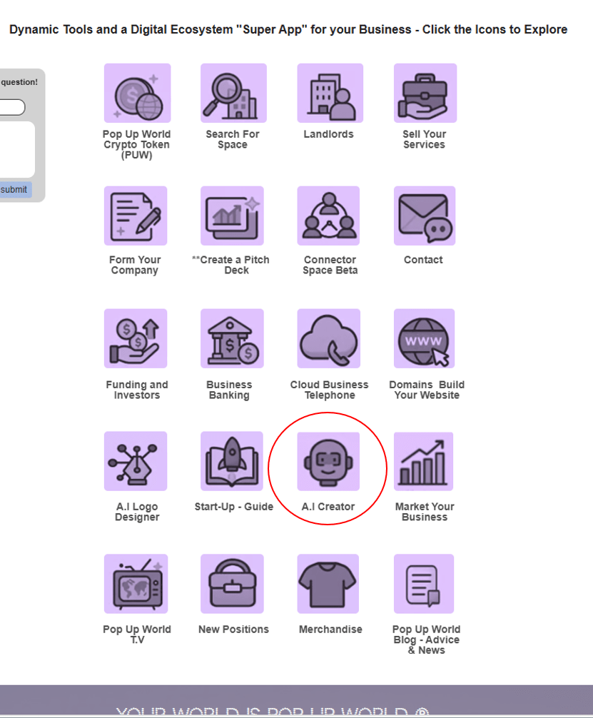 It starts with an idea. Pop Up World is a platform that helps start-ups and small businesses reach for the stars. No matter what size you are. Use our start-up guide Business Zero to Superhero, Design your Logo. Connect with investors via our Investor Connector. You can start a Website and Domain name. You can Search for and promote your Premises. You can promote your idea for free on our Pop Up World Ads site, you can even form a Limited Company You can also join us on our journey via the Pop Up World Token (PUW).