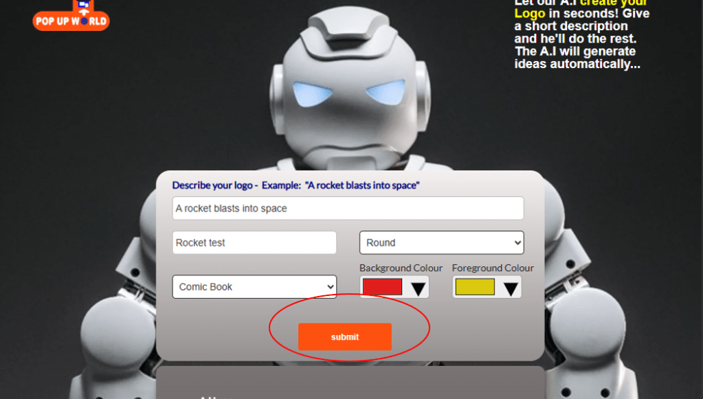 Enter the Description of your Logo, for example, “a rocket blasting off into space”.