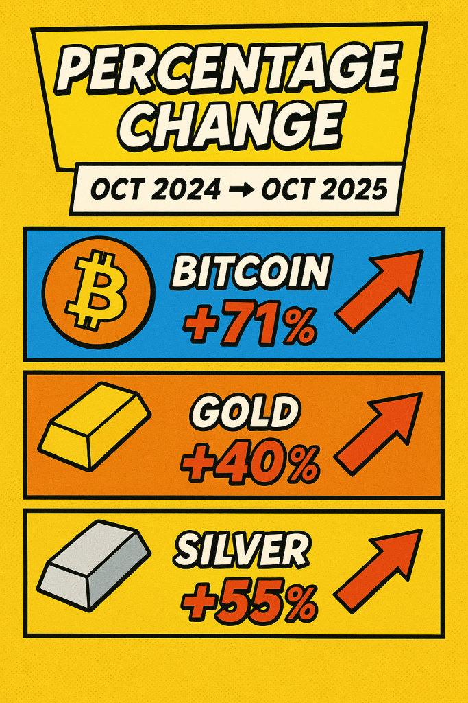 The data is clear: Bitcoin, gold and silver have risen astronomically between October 2024 and October 2025.