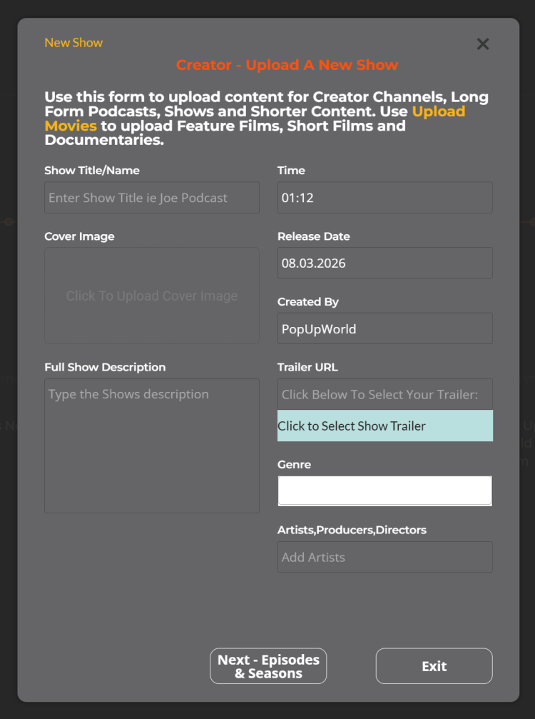 Enter all the Show’s details into the “Upload New Show” Form: