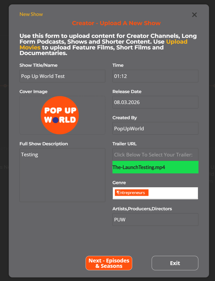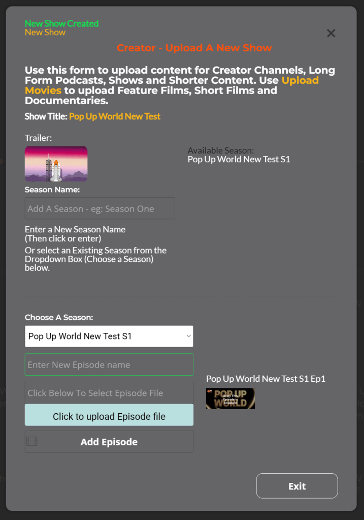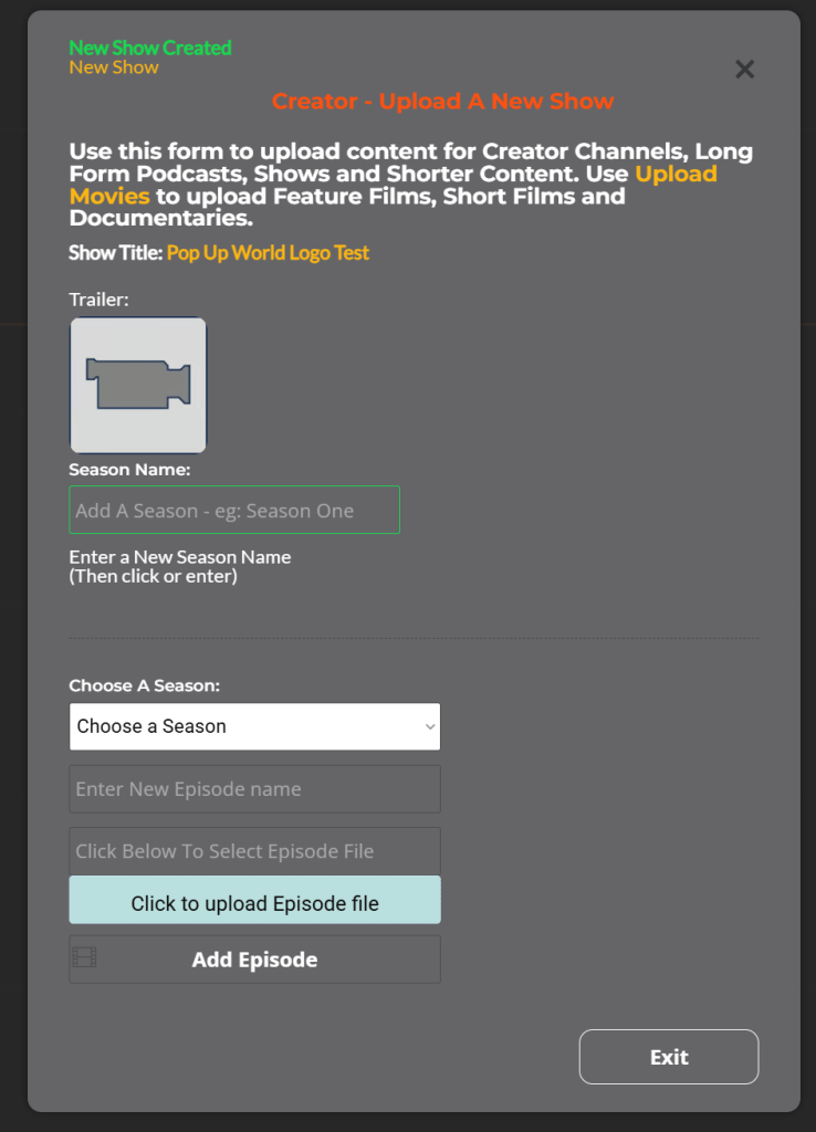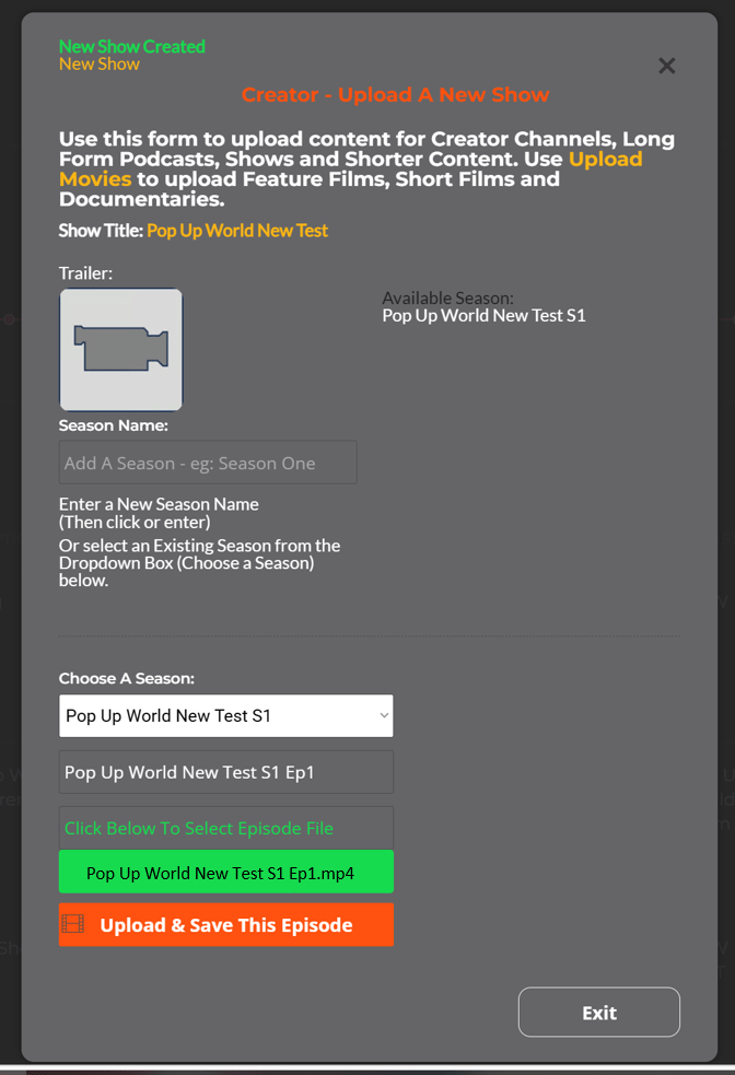 You can also Exit and add additional Episodes as and when you create them later. (Just remember to enter the exact Show Name in the Upload Form and click Next-Episodes and Seasons. (The fields will be highlighted green).