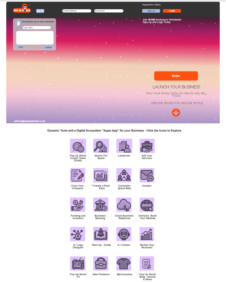 It starts with an idea. Pop Up World is a platform that helps start-ups and small businesses reach for the stars. No matter what size you are. Use our start-up guide Business Zero to Superhero, Design your Logo. Connect with investors via our Investor Connector. You can start a Website and Domain name. You can Search for and promote your Premises. You can promote your idea for free on our Pop Up World Ads site, you can even form a Limited Company You can also join us on our journey via the Pop Up World Token (PUW).