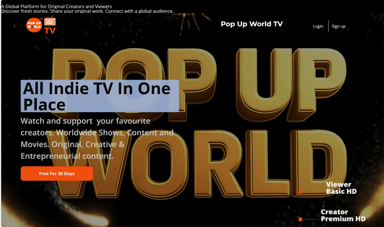 Pop Up World TV allows subscribers (Supporters) to view Original Content, Podcasts, Movies and TV Shows, brought to you by independent video makers (Content Creators) from all over the world!