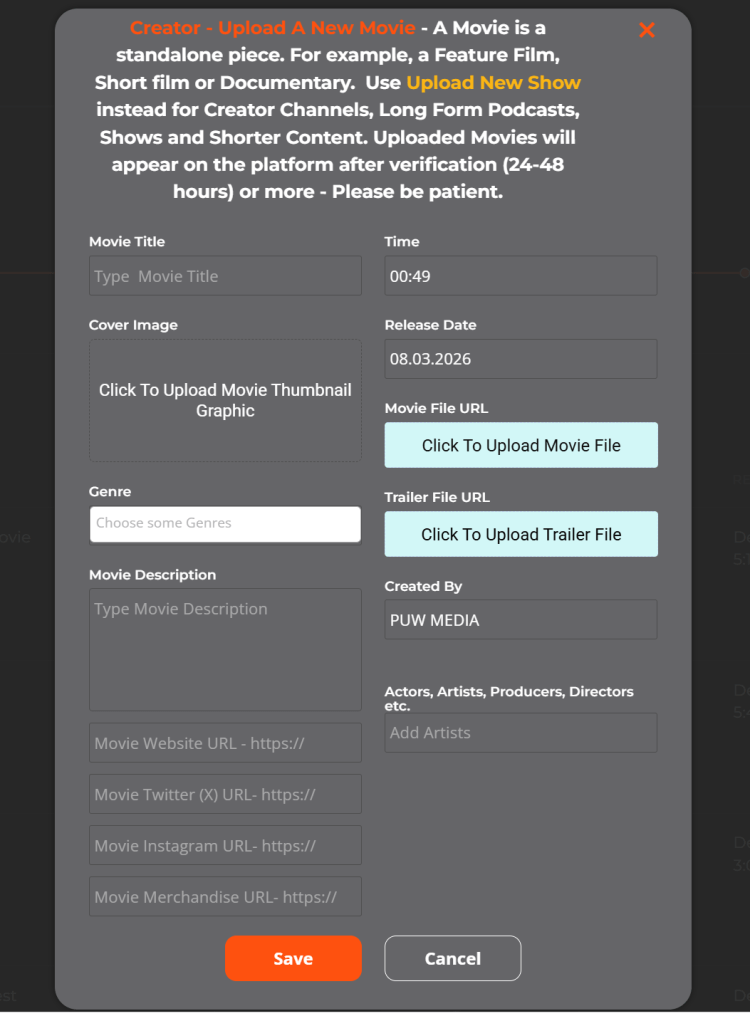 Uploaded Movies will appear on the platform after verification (24-48 hours) or more –